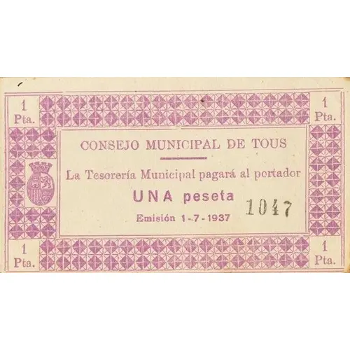 1 Pta. CONSEJO MUNICIPAL DE TOUS La Tesorería Municipal pagará al portador UNA peseta Emisión 1-7-1937 (Translation: 1 Peseta Municipal Council of Tous The Municipal Treasury will pay the bearer One Peseta Issued July 1, 1937) |