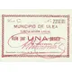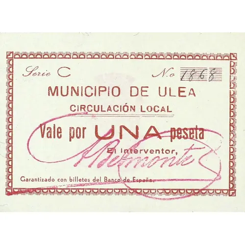 MUNICIPIO DE ULEA CIRCULACIÓN LOCAL Vale por UNA peseta Garantizado con billetes del Banco de España. (Translation: Municipality of Ulea Local circulation Voucher for One Peseta Guaranteed with banknotes from the Bank of Spain.) |