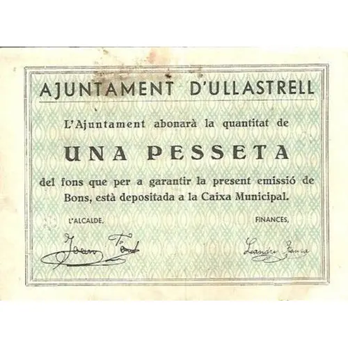 (Translation: City Council of Ullastrell The City Council will pay the amount of One Peseta of the fund that, to guarantee the present issuance of Bonds, is deposited in the Municipal Treasury.)