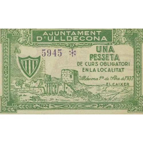 AJUNTAMENT D`ULLDECONA UNA PESSETA DE CURS OBLIGATORI EN LA LOCALITAT Ulldecona, 1er de Sbre. de 1937 (Translation: City Council of Ulldecona One Peseta of mandatory course in the city Ulldecona, September 1, 1937) |