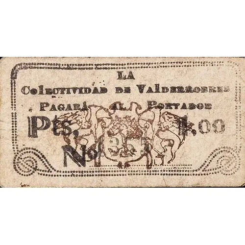 LA COLECTIVIDAD DE VALDERROBRES PAGARÁ AL PORTADOR Pts, 1,00 (Translation: The Collectivity of Valderrobres Will pay the bearer 1.00 Pesetas) |