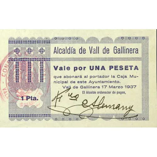 Alcaldía de Vall de Gallinera Vale por UNA PESETA que abonará al portador la Caja Municipal de este Ayuntamiento. Vall de Gallinera 17 Marzo 1937 1 Pta. (Translation: Mayoralty of Vall de Gallinera Voucher for One Peseta which will be paid to the bearer by the Municipal Fund of this City Council. Vall de Gallinera March 17, 1937 1 Peseta) |