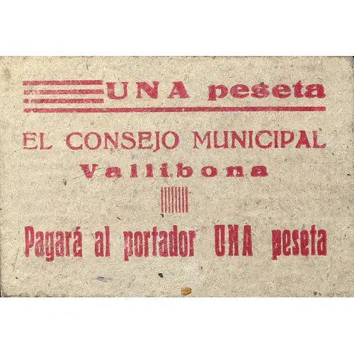 UNA peseta EL CONSEJO MUNICIPAL Vallibona Pagará al portador UNA peseta (Translation: One Peseta The Municipal Council Vallibona Will pay the bearer One Peseta) |