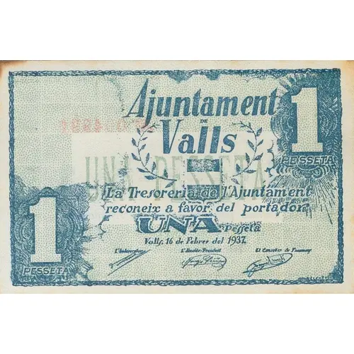 1 PESSETA 1 Emissió feta per acord de l`Ajuntament en la sessió del 15 de Febrer del 1937. De circulació a Valls (Translation: 1 Peseta 1 Issued by agreement of the City Council in the session of February 15, 1937 Of circulation in Valls) |
