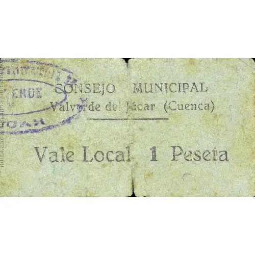 (Translation: Municipal Council Valverde de Júcar (Cuenca) Local voucher 1 Peseta)