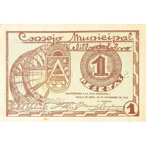 Consejo Municipal Velilla de Ebro 1 PESETAS REINTEGRABLE A LA CAJA MUNICIPAL VELILLA DE EBRO, 24 DE NOVIEMBRE DE 1937 (Translation: Municipal Council of Velilla de Ebro 1 Pesetas Reintegrable to the Municipal Fund Velilla de Ebro, November 24, 1937) |