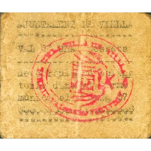 AJUNTAMENT DE VIELLA VAL d`UNA pesseta de circulació obligatoria dins el terme municipal - Maig 37 (Translation: Ciy Council of Viella Voucher of One Peseta of mandatory circulation within the municipal term - May 1937) |