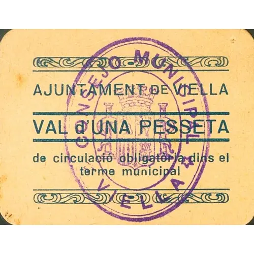 | Obverse lettering | AJUNTAMENT DE VIELLA VAL d`UNA PESSETA de circulació obligatoria dins el terme municipal (Translation: Ciy Council of Viella Voucher of One Peseta of mandatory circulation within the municipal term) |