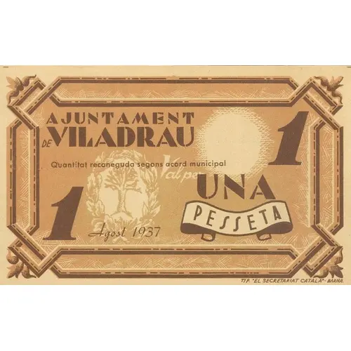AJUNTAMENT DE VILADRAU Quantitat reconeguda segons acord municipal UNA PESSETA Agost 1937 (Translation: City Council of Viladrau Amount recognized according to municipal agreement One Peseta August 1937) |