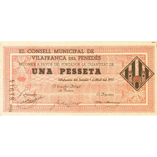 | Obverse lettering | EL CONSELL MUNICIPAL DE VILAFRANCA DEL PENEDÈS RECONEIX A FAVOR DEL PORTADOR LA QUANTITAT DE UNA PESSETA Vilafranca del Penedès 1 d`Abril del 1937 (Translation: The Municipal Council of Vilafranca del Penedès Recognizes in favor of the bearer the amount of One Peseta Vilafranca del Penedès April 1, 1937) |