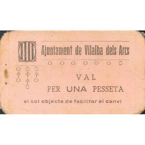Ajuntament de Vilalba dels Arcs VAL PER UNA PESSETA al sol objecte de facilitar el canvi (Translation: City Council of Vilalba dels Arcs Valid for One Pesseta with the sole purpose of facilitating change) |