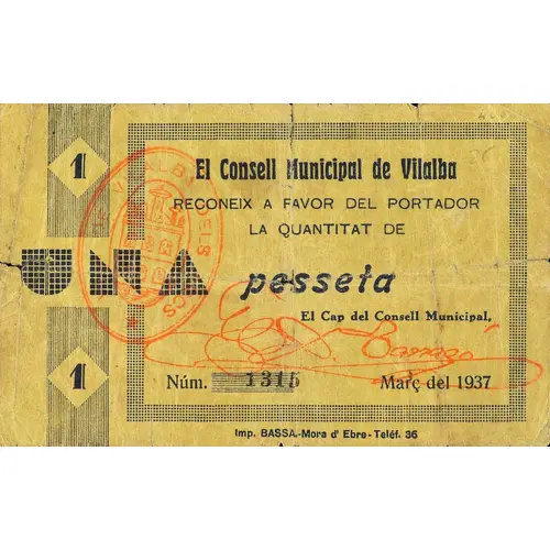 1 El Consell Municipal de Vilalba RECONEIX A FAVOR DEL PORTADOR LA QUANTITAT DE UNA pesseta Març del 1937 (Translation: The Municipal Council of Vilalba Recognizes in favor of the bearer the amount of One Peseta March of 1937) |