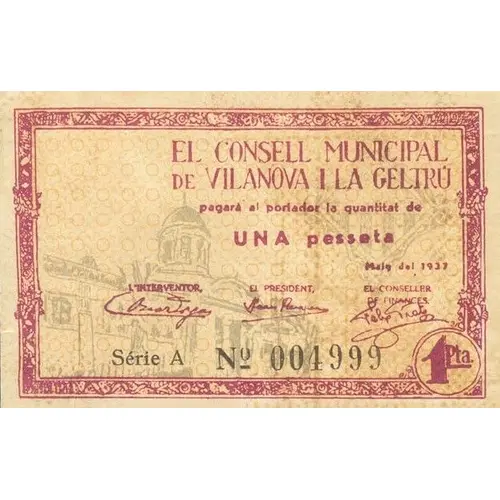 | Obverse lettering | EL CONSELL MUNICIPAL DE VILANOVA I LA GELTRÚ pagarà al portador la quantitat de UNA pesseta Maig del 1937 (Translation: The Municipal Council of Vilanova i la Geltrú Will pay the bearer the amount of One Peseta May 1937) |
