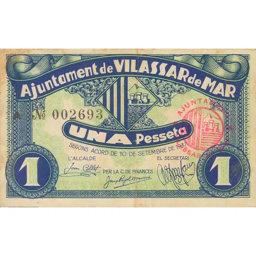 Ajuntament de VILASSAR de MAR UNA Pesseta SEGONS ACORD DE 10 DE SETEMBRE DE 1937 (Translation: City Council of Vilassar de Mar One Peseta According to agreement of September 10, 1937) |