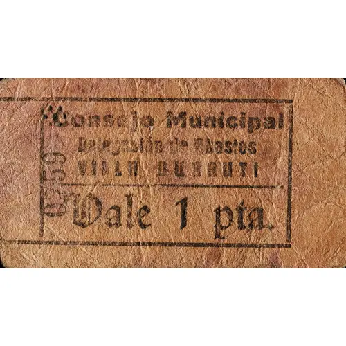 Consejo Municipal Delegación de Abastos VILLA DURRUTI Vale 1 pta. (Translation: Municipal Council Supply Delegation Villa Durruti Value 1 Peseta) |