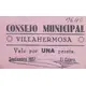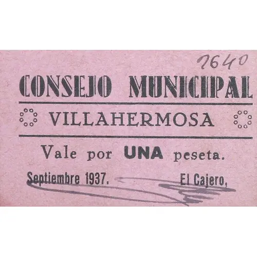 CONSEJO MUNICIPAL VILLAHERMOSA Vale por UNA peseta. Septiembre 1937 (Translation: Municipal Council Villahermosa Voucher for One Peseta September, 1937) |