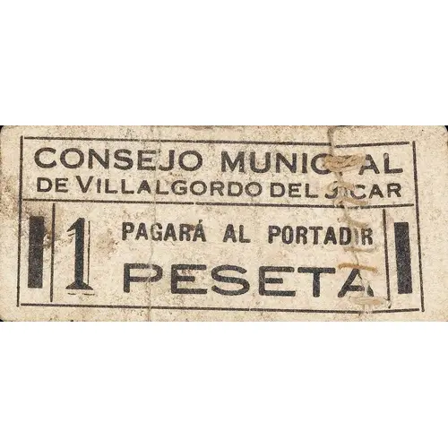 | Obverse lettering | CONSEJO MUNICIPAL DE VILLALGORDO DEL JÚCAR PAGARÁ AL PORTADOR 1 PESETA (Translation: Municipal Council of Villalgordo del Júcar Will pay the bearer 1 Peseta) |