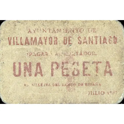 1 AYUNTAMIENTO DE VILLAMAYOR DE SANTIAGO PAGARÁ AL PORTADOR UNA PESETA EN BILLETES DEL BANCO DE ESPAÑA JULIO 1937 (Translation: City Council of Villamayor de Santiago Will pay the bearer One Peseta In banknotes of the Bank of Spain July 1937) |