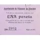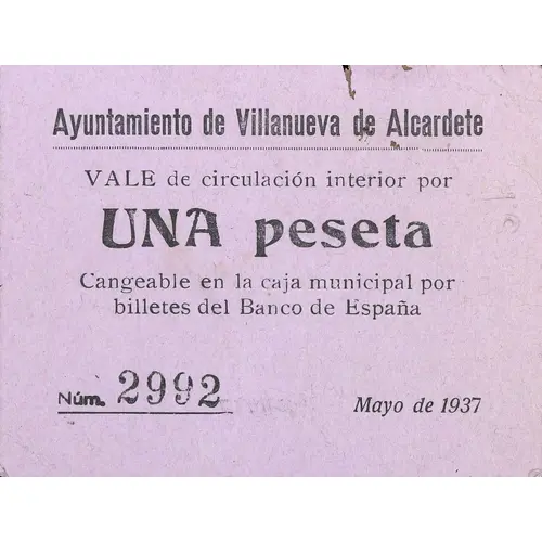 Ayuntamiento de Villanueva de Alcardete VALE de circulación interior por UNA peseta Cangeable en la caja municipal por billetes del Banco de España Mayo de 1937 (Translation: City Council of Villanueva de Alcardete Voucher for internal circulation One Peseta Exchangeable in the municipal treasury for banknotes from the Bank of Spain May 1937) |