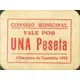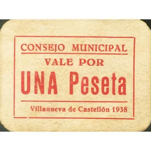 | Obverse lettering | CONSEJO MUNICIPAL VALE POR UNA Peseta Villanueva de Castellón 1938 (Translation: Municipal Council Valid for One Peseta Villanueva de Castellón 1938) |