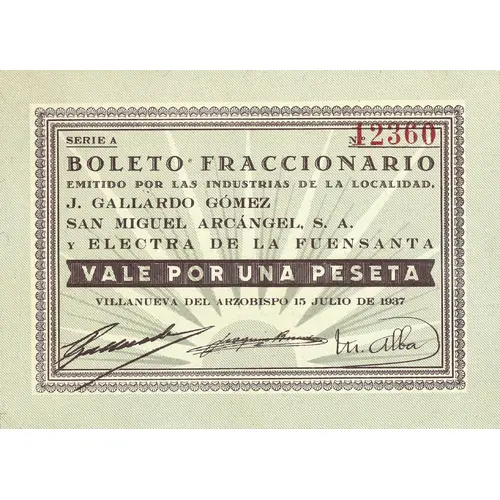 | Obverse lettering | BOLETO FRACCIONARIO EMITIDO POR LAS INDUSTRIAS DE LA LOCALIDAD, J. GALLARDO GÓMEZ SAN MIGUEL ARCÁGEL, S. A. Y ELECTRA DE LA FUENSANTA VALE POR UNA PESETA VILLANUEVA DEL ARZOBISPO 15 JULIO DE 1937 (Translation: Fractional ticket Issued by local industries, J. Gallardo Gomez San Miguel Arcangel, S. A. and Electra de la Fuensanta It`s worth One Peseta Villanueva del Arzobispo July 15, 1937) |