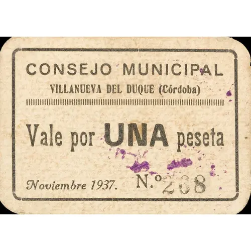 | Obverse lettering | CONSEJO MUNICIPAL VILLANUEVA DEL DUQUE (Córdoba) Vale por UNA peseta Noviembre 1937. (Translation: Municipal Council Villanueva del Duque (Córdoba) Valid for One Peseta November 1937.) |