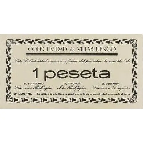 COLECTIVIDAD de VILLARLUENGO Esta Colectividad reconoce a favor del portador la cantidad de 1 peseta EMISIÓN 1937.- La validez de este Bono la acredita el sello de esta Colectividad, estampado al dorso (Translation: Collectivity of Villarluengo This Collectivity recognizes in favor of the bearer the amount of 1 Peseta Issue 1937. The validity of this Bond is accredited by the stamp of this Collectivity stamped at back) |