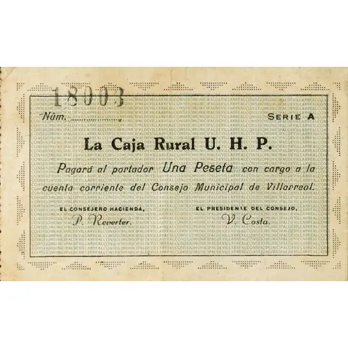 La Caja Rural U. H. P. Pagará al portador Una Peseta con cargo a la cuenta corriente del Consejo Municipal de Villarreal (Translation: The Rural Fund U.H.P. Will pay the bearer One Peseta charged to the current account of the Municipal Council of Villarreal) |