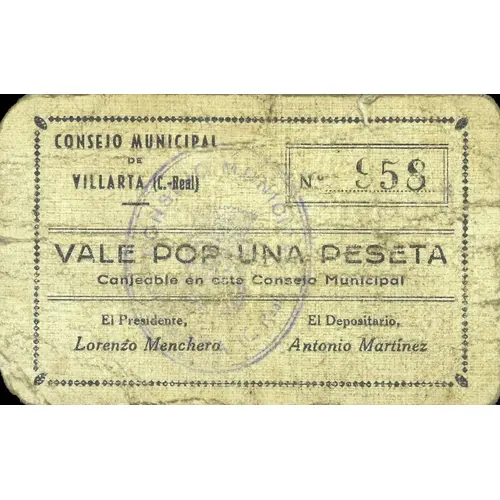 CONSEJO MUNICIPAL DE VILLARTA (C.- Real) VALE POR UNA PESETA Canjeable en este Consejo Municipal (Translation: Municipal Council of Villarta (Ciudad Real) Voucher for One Peseta Exchangeable in this Municipal Council) |
