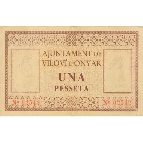 1 Circulació obligatòria en tot el Districte Municipal de Viloví d`Onyar, segons acord de data 1 de Juny del 1937. UNA PESSETA (Translation: Mandatory circulation throughout the Municipal District of Viloví d`Onyar, according to the agreement dated June 1, 1937. One Peseta) |