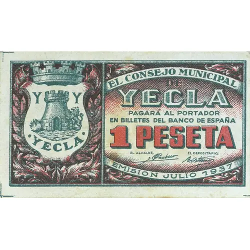 EL CONSEJO MUNICIPAL DE YECLA PAGARÁ AL PORTADOR EN BILLETES DEL BANCO DE ESPAÑA 1 PESETA EMISION JULIO 1937 (Translation: The Municipal Council of Yecla Will pay the bearer in banknotes of the Bank of Spain 1 Peseta Issue of July 1937) |