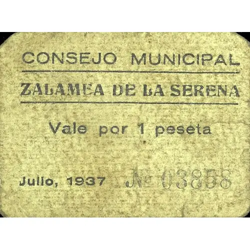 | Obverse lettering | CONSEJO MUNICIPAL ZALAMEA DE LA SERENA Vale por 1 peseta Julio, 1937 (Translation: Municipal Council Zalamea de la Serena Voucher for 1 Peseta July, 1937) |