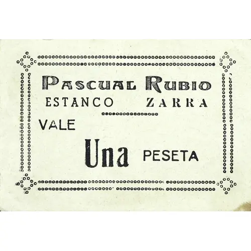| Obverse lettering | PASCUAL RUBIO ESTANCO ZARRA VALE Una PESETA (Translation: Pascual Rubio Tobacco shop ZARRA It`s worth One Peseta) |