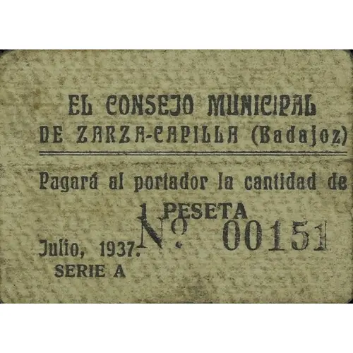 EL CONSEJO MUNICIPAL DE ZARZA-CAPILLA (Badajoz) Pagará al portador la cantidad de 1 PESETA Julio, 1937. (Translation: The Municipal Council of Zarza-Capilla Will pay the bearer the amount of 1 Peseta July, 1937.) |