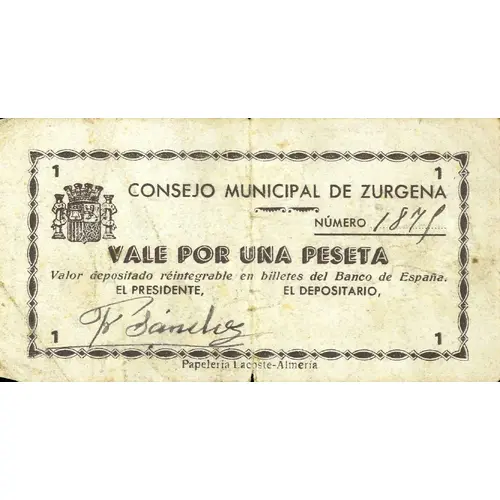 | Obverse lettering | CONSEJO MUNICIPAL DE ZURGENA VALE POR UNA PESETA Valor depositado reintegrable en billetes del Banco de España (Translation: Municipal Council of Zurgena Voucher for One Peseta Amount deposited repayable in banknotes of the Bank of Spain) |