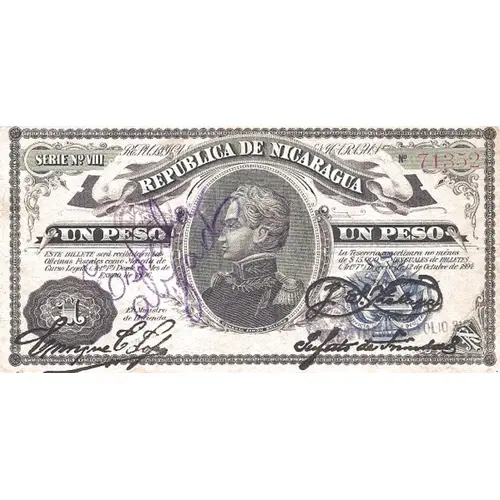 REPÚBLICA DE NICARAGUA SERIE Nº VIII UN PESO ESTE BILLETE será recibido en las oficinas Fiscales como moneda de Curso Legal (Art.1º) Desde el mês de ENERO de 1896. La Tesoreria amortizara no ménos de $15.000ºº MENSUALES DE BILLETES (Art.7º) Decreto de 12 de Octubre de 1894. (Translation: Republic of Nicaragua Series no. VIII One Peso This note will be received at the Fiscal Offices as Legal Tender currency (Art.1º) Since the month of January, 1896. The Treasury will amortize no less than $15,000 monthly of banknotes (Art.7) Decree of October 12, 1894.) |
