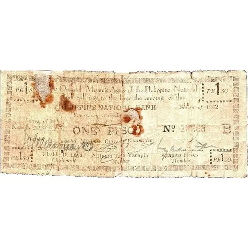 | Reverse lettering | PHILIPPINE NATIONAL BANK EMERGENCY CIRCULATING NOTE SERIES OF 1941 ONE PESO |