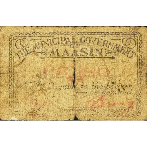 | Obverse lettering | THE MUNICIPAL GOVERNMENT OF MAASIN 1 PESO PAYABLE TO THE BEARER ON DEMAND |