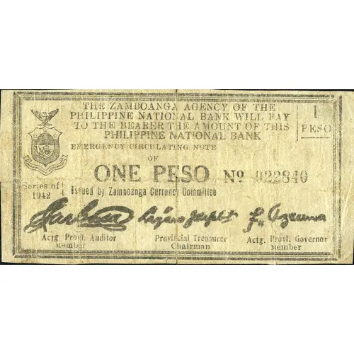 | Obverse lettering | THE ZAMBOANGA AGENCY OF THE PHILIPPINE NATIONAL BANK WILL PAY TO THE BEARER THE AMOUNT OF THIS PHILIPPINE NATIONAL BANK EMERGENCY CIRCULATION NOTE OF ONE PESO ISSUED BY ZAMBOANGA CURRENCY COMMITTEE |