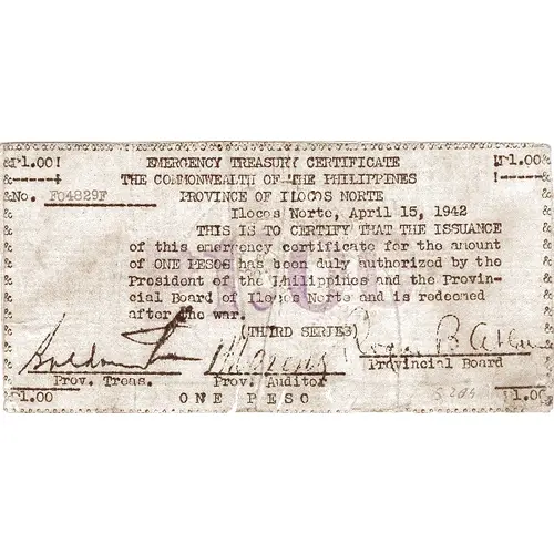 EMERGENCY TREASURY CERTIFICATE THE COMMONWEALTH OF THE PHILIPPINES PROVINCE OF ILOCOS NORTE This is to certify that the issuance of this emergency certificate for the amount of ONE PESO has been duly authorized by the President of the Philippines and the Provincial Board of Ilocos Norte and is redeemed after the war (THIRD SERIES) ONE PESO |