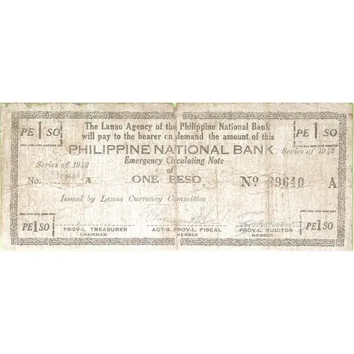 | Vorderseitenlegende | 1 PESO THE LANAO AGENCY OF THE PHILIPPINE NATIONAL BANK WILL PAY TO THE BEARER ON DEMAND THE AMOUNT OF THIS PHILIPPINE NATIONAL BANK EMERGENCY CIRCULATING NOTE OF ONE PESO |