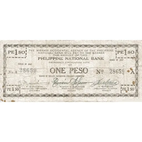 Leyenda del anverso THE MISAMIS OCCIDENTAL AGENCY OF THE PHILIPPINE NATIONAL BANK WILL PAY TO THE BEARER THE AMOUNT OF THIS PHILIPPINE NATIONAL BANK EMERGENCY CIRCULATING NOTE OF ONE PESO ISSUED BY MISAMIS OCCIDENTAL CURRENCY COMMITTEE