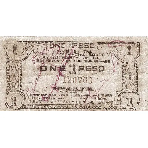 | Obverse lettering | ONE PESO ISUED BY THE LEYTE PROVINCIAL BOARD BY AUTHORITY OF THE PRESIDENT OF THE PHILIPPINES ONE PESO LEYTE EMERGENCY CURRENCY BOARD |