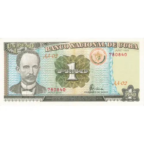 Obverse lettering BANCO NACIONAL DE CUBA BANCO NACIONAL DE CUBA (in arms) 1 PESO JOSÉ MARTÍ GARANTIZADO INTEGRAMENTE CON EL ORO, CAMBIO EXTRANJERO CONVERTIBLE EN ORO Y TODOS LOS DEMÁS ACTIVOS DEL BANCO NACIONAL DE CUBA. ESTE BILLETE CONSTITUYE UNA OBLIGACIÓN DEL ESTADO CUBANO.