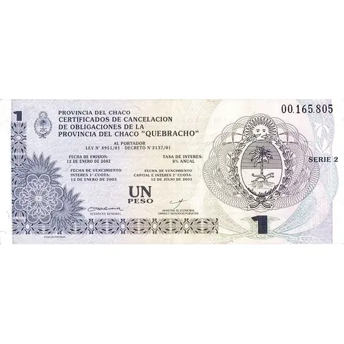 | Obverse lettering | PROVINCIA DEL CHACO CERTIFICADOS DE CANCELACION DE OBLIGACIONES DE LA PROVINCIA DEL CHACO `QUEBRACHO` AL PORTADOR LEY N° 4951/01 - DECRETO N° 2137/01 FECHA DE EMISIÓN: TASA DE INTERES 12 de Enero de 2002 8% ANUAL FECHA DE VENCIMIENTO FECHA DE VENCIMIENTO INTERES 1° CUOTA: CAPITAL E INTERESES 2° CUOTA: 12 de ENERO de 2003 12 de JULIO 2003 UN PESO (Translation: CHACO PROVINCE CERTIFICATES OF CANCELLATION OF OBLIGATIONS OF THE PROVINCE OF CHACO `QUEBRACHO` TO THE CARRIER LAW N ° 4951/01 - DECREE N ° 2137/01 ISSUE DATE: INTEREST RATE January 12, 2002 8% ANNUAL EXPIRATION DATE EXPIRATION DATE INTEREST 1st FEE: CAPITAL AND INTEREST 2nd FEE: JANUARY 12, 2003 JULY 12, 2003 ONE PESO) |