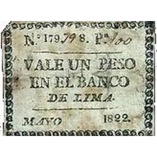 | Obverse lettering | N° 179798. P° 1 00 VALE UN PESO EN EL BANCO DE LIMA MAYO 1822. (Translation: N° 179798. P° 1 00 WORTH ONE PESO IN THE BANK OF LIMA MAY 1822.) |