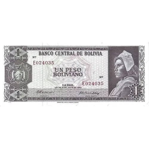| Obverse lettering | BANCO CENTRAL DE BOLIVIA UN PESO BOLIVIANO LA PAZ, LEY DE 13 DE JULIO DE 1962 CAMPESINO (Translation: Central Bank of Bolivia One Peso Boliviano La Paz, Law from July 13th., 1962 Farmer) |