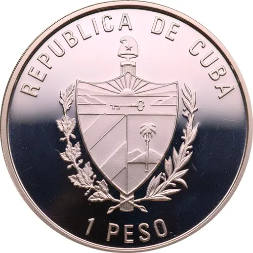 Technical/Grading: Struck in .999 fine silver (20 grams, 38 millimeters), this coin exhibits superior technical qualities. High-points for grading include the intricate details of the Cuban coat of arms on the obverse, especially the palm tree and Phrygian cap. On the reverse, the hair, facial features, and contours of both Castro and Hemingway's portraits should display full, sharp relief. A strong strike ensures crisp separation of design elements from fields, typically proof-like or brilliant uncirculated.