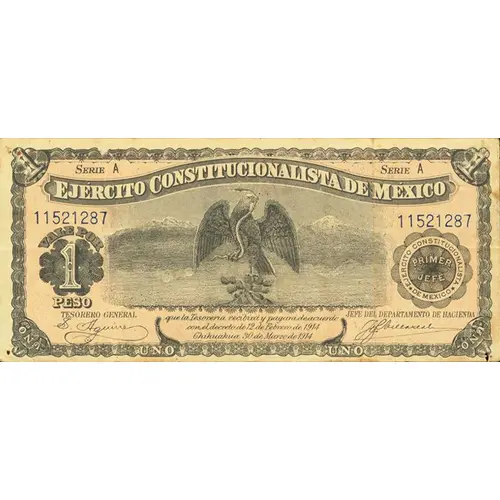 Ejército Constitucionalista de México Vale por 1 Peso Primer Jefe Ejercito Constitucionalista de Mexico Que la Tesorería recibirá y pagará de acuerdo con el decreto de 12 de Febrero de 1914 Chihuahua, 30 de Marzo de 1914 (Translation: Constitutionalist Army of Mexico Voucher for 1 Peso First boss Constitutionalist Army of Mexico That the Treasury will receive and pay in accordance with the decree of February 12, 1914 Chihuahua, March 30, 1914) |
