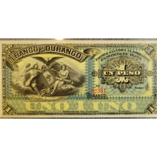 (Translation: The Bank of Durango will pay the bearer with silver coins One Peso)
